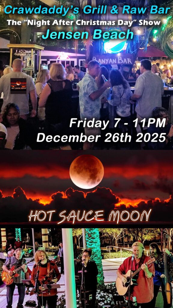Hot Sauce Moon performs “live” in Stuart at this fabulous space on Hutchinson Island. 6pm to 9-ish.