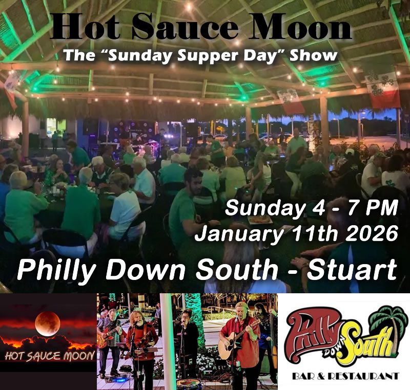 Hot Sauce Moon performs “live” in Stuart at this fabulous space on Hutchinson Island. 4pm to 7-ish.