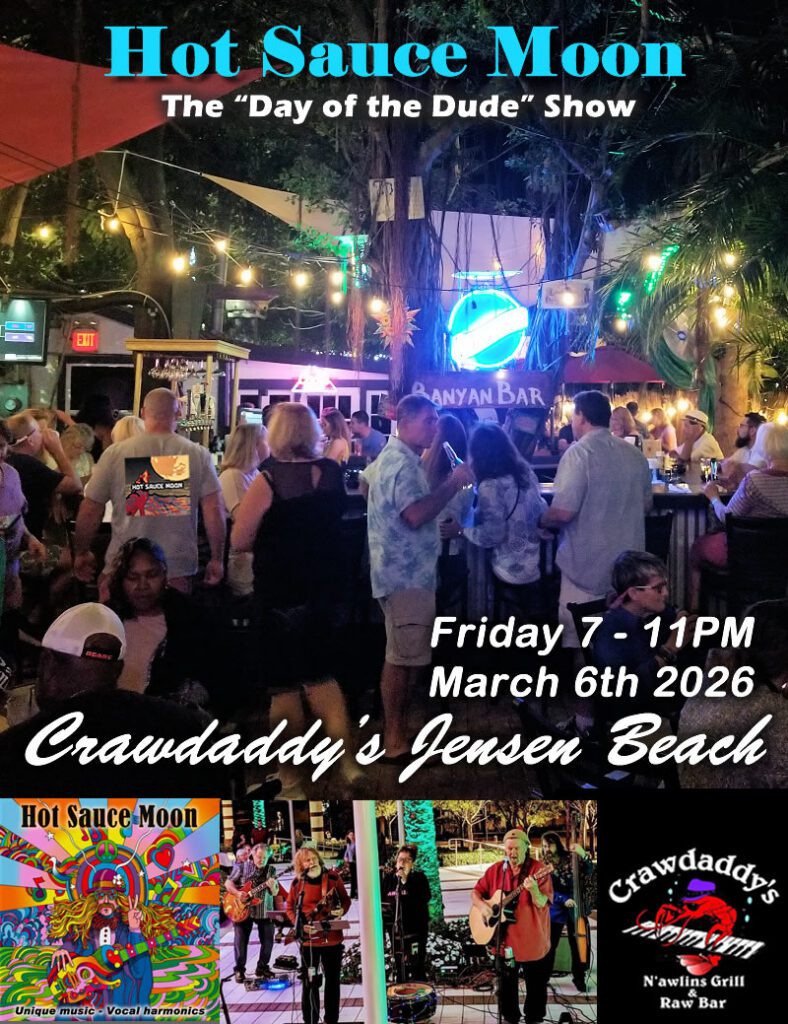 Hot Sauce Moon performs “live” in Stuart at this fabulous space on Hutchinson Island. 4pm to 7-ish.